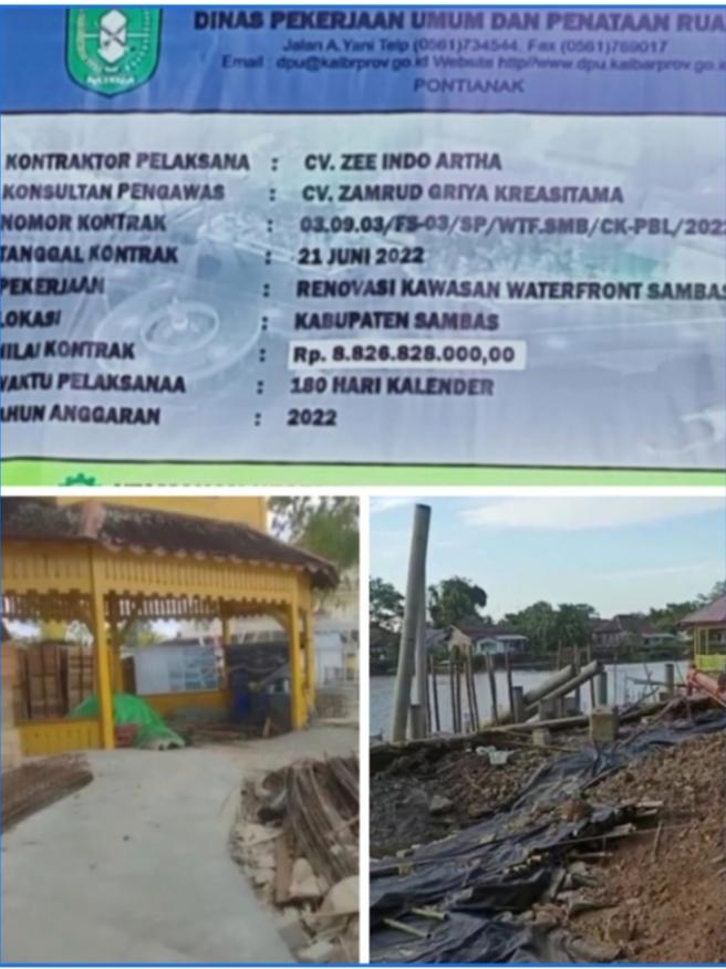 "Pelaksanaan tender di-ikuti 173 ,yang mendaftar 24 peserta.Pada no urut 12. CV.Zee Indo Artha ditetapkan sebagai pemenangnya. Proyek renovasi waterfront Keraton Sambas,CV. Zamrud Griya Kreasitama selaku konsultan supervesinya. Dalam kontrak kerja ,SPK di keluarkn pada tanggal 21 juni,2022,No.03.09.03/FS-03/SP/WTF.SMB/CK-PBL/2022/DPUPR,APBD 2022,sebesar,Rp.8.826.828.000; dengan jangka waktu 180 hari.