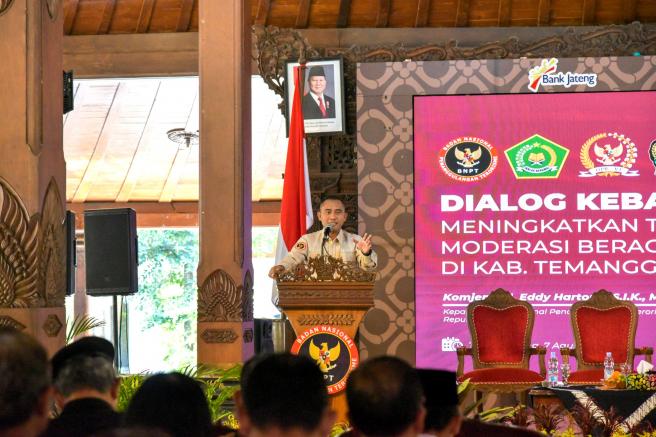 "Alhamdulillah kita dengan Komisi XIII DPR RI dan Pemkab Temanggung hari ini melakukan Dialog Kebangsaan sebagai bagian dari langkah - langkah kita yang sistematis berkesinambungan dan berkelanjutan dalam memperkuat moderasi beragama, dimana salah satu prinsipnya adala komitmen kebangsaan yakni setia pada ideologi Pancasila," kata Kepala BNPT Komjen. Pol. Eddy Hartono, S.I.K., M.H., saat membuka kegiatan.