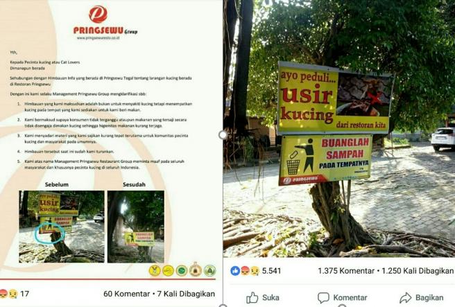 JAKARTA, SJKPK | Sebuah rumah makan di perlintasan jalur Pantura Tegal – Pemalang Jawa Tengah menjadi bulan-bulanan para netizen pecinta Kucing di sebuah akun media sosial Facebook. Hal tersebut bermula ketika seseorang mengunggah foto himbauan yang dituliskan oleh management rumah makan yang diketahui bernama restoran Pringsewu.