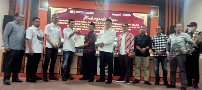 Tampak hadir penyelengaraan Rapat Pleno jajaran KPU Kabupaten Tangerang dan KPU Provinsi Banten serta Bawaslu Kabupaten Tangerang saat menyerahkan berita acara hasil verifikasi faktual kepada pasangan Zulkarnain - Lerru yang akan berlaga di Pilkada serentak tahun 2024.