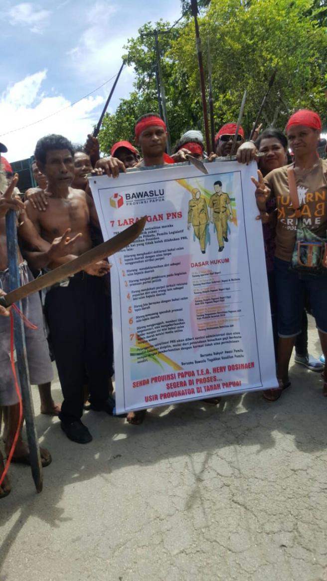 “Pendukung serta Masyarakat Biak Barat dan Swandiwe pastikan akan ada konflik besar-besaran, hal ini ditunjukkan ketika melakukan aksi pada hari senin 23 April 2018 di Kantor Panwas dan Kantor Bupati Kab. Biak Numfor, nampak masyarakat Biak Barat dan Swandiwe sampai membawa alat-alat tajam,” Tandasnya.